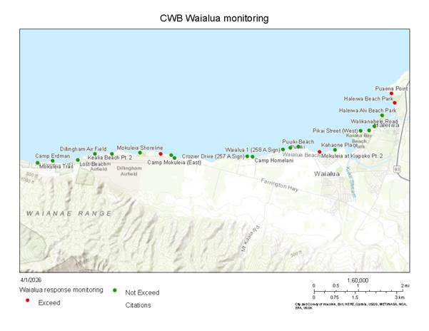 DOH collected samples from 22 beach sites on the North Shore of Oʻahu, supplementing its regular testing of 80 beach sites per week. Samples were tested for bacterial indicators, known as Enterococci, which may signal an increased risk of gastrointestinal illness for swimmers. Results at four of the 22 monitoring stations exceeded DOH’s beach action value: Puaʻena Point, Haleʻiwa Beach Park, Mokulēʻia at Kiapoko Pt. 2, and Kawaihāpai 1. DOH has posted advisory signs at each of these locations.