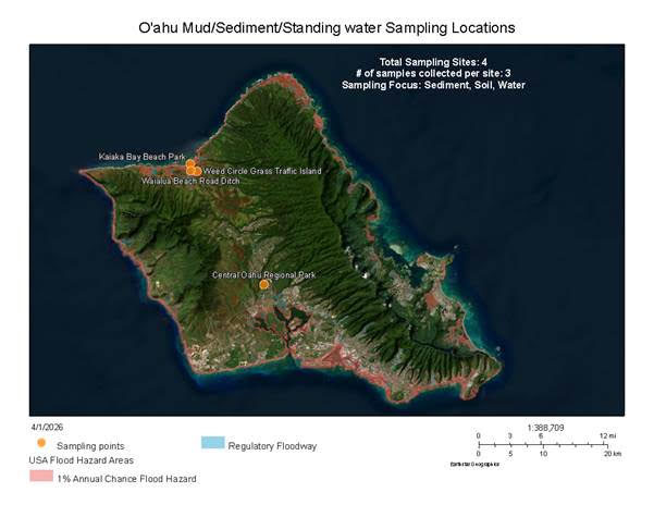 Precautionary environmental monitoring confirmed expected pathogens in flood-carried mud, sediment, and nearshore waters impacted by the Kona Low Storms. These results also confirm that recommended precautions greatly reduce possible risk.
